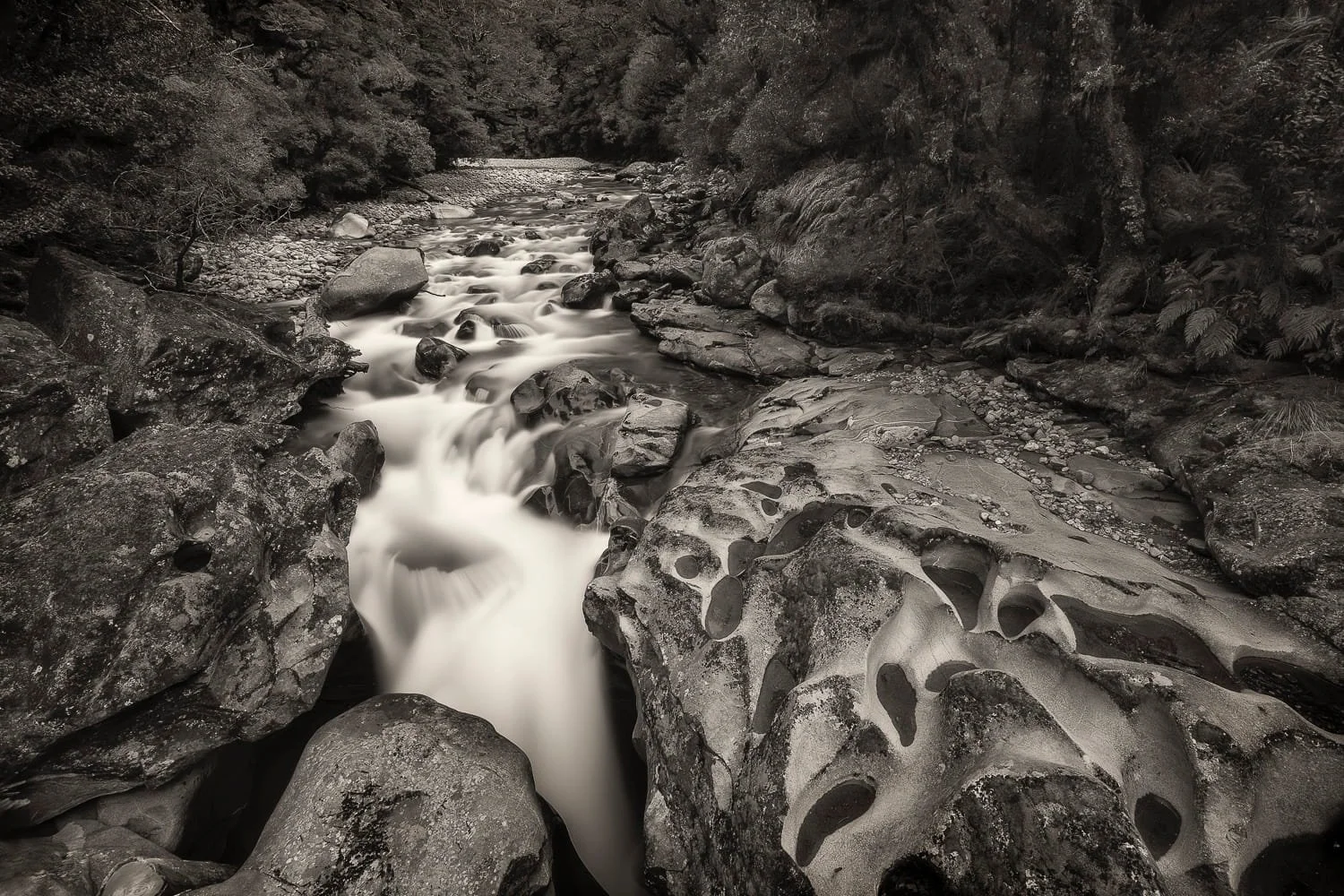 I hadn’t eaten all day when I made this photo, from a bridge across a fast flowing creek on the road into Milford Sound. With the light fading and the restaurant about to close it looked like I was going to, once again, miss dinner.